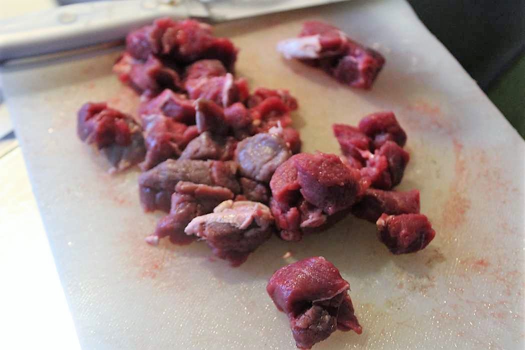 Fleisch erst in Streifen schneiden, danach würfeln.