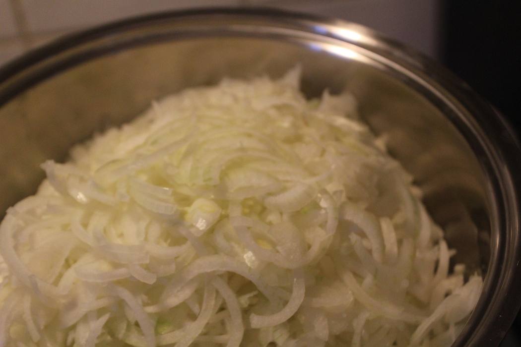 In der Zwischenzeit die Zwiebeln zerkleinern. Ich nehme meine Zauberette, aber man kann die natürlich auch mit dem Messer schneiden.