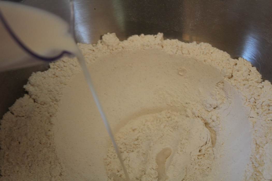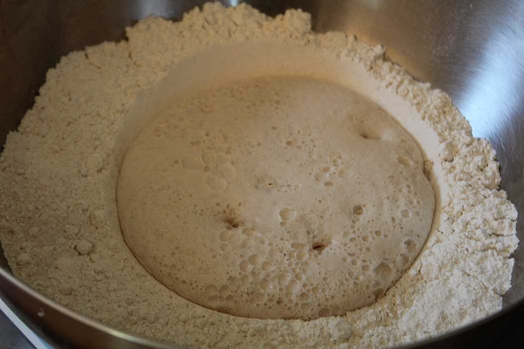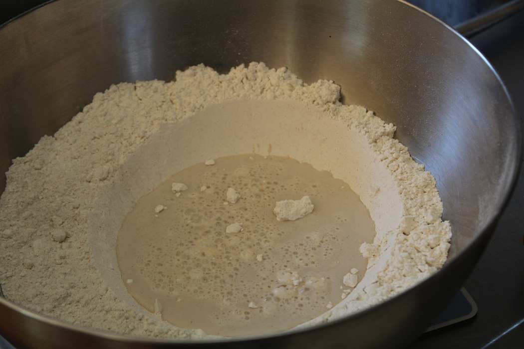 In die Mulde wird die Wasser-Milchmischung mit der Hefe gekippt.