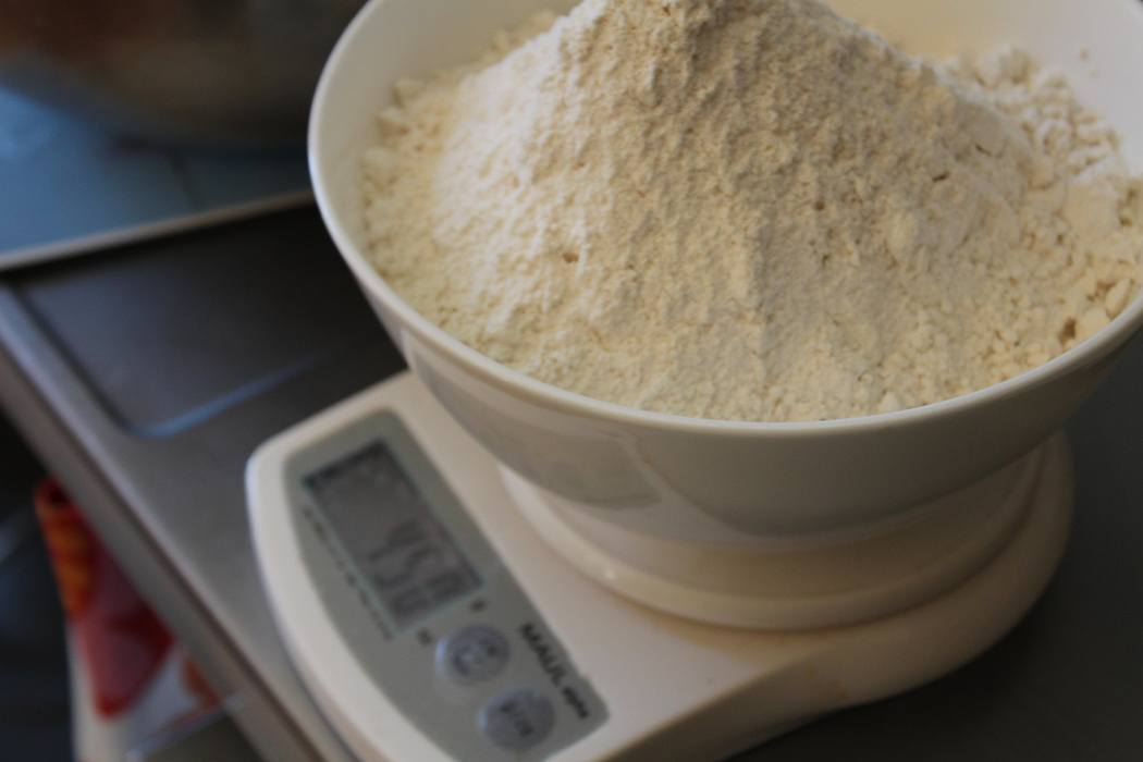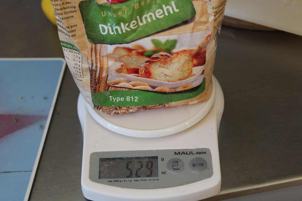 Ich musste erstmal schauen, ob ich noch genug Dinkelmehl habe. Reicht noch, um 450 Gramm abzuwiegen