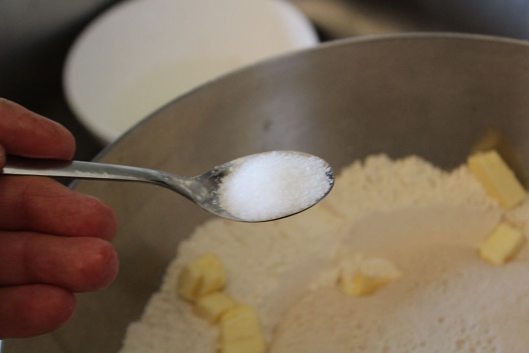 1 Prise Zucker in die Flüssigkeit geben, damit die Hefe besser arbeitet.