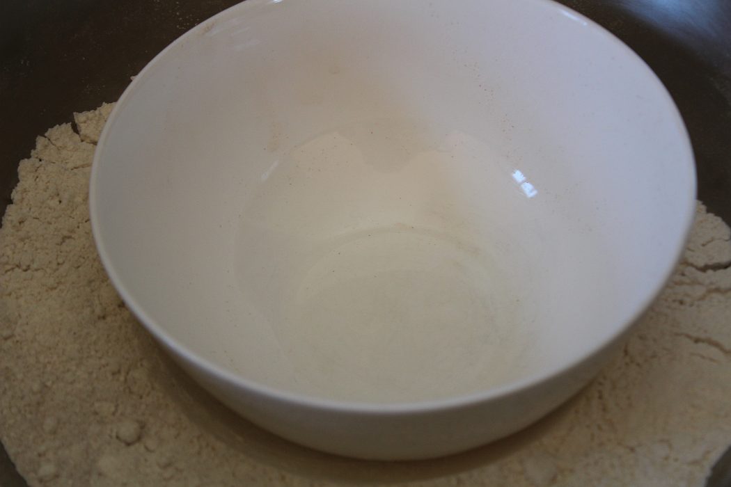 Mit einer kleinen Schüssel eine Mulde in das Mehl drücken.