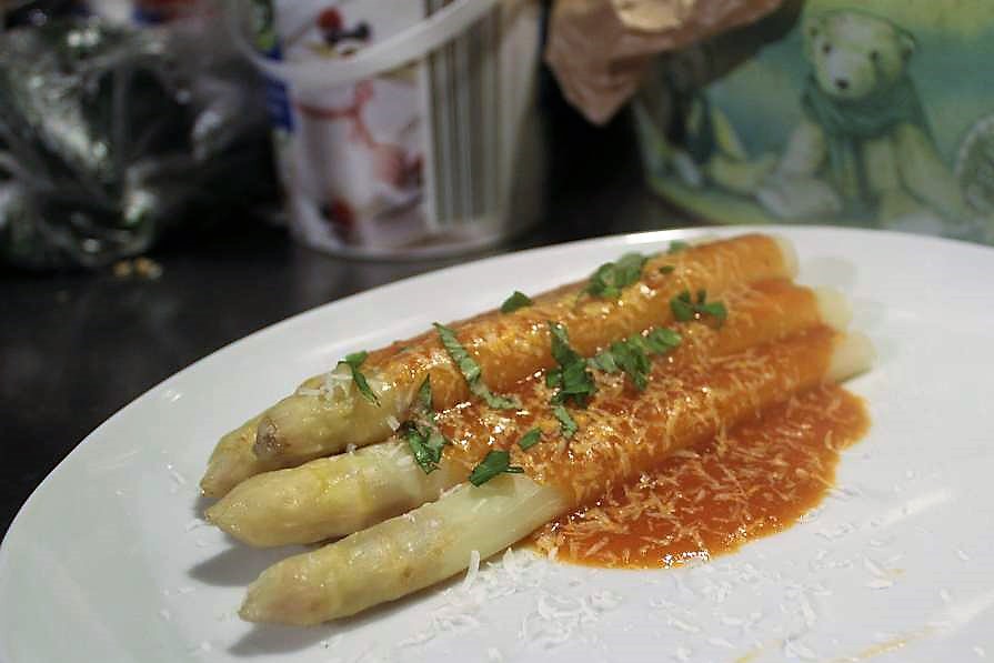 Ich denke ja immer an alle. Meine Frau hat gemeckert, dass ich den Spargel zuletzt immer in der Pfanne gebraten habe, weil ich finde, dass er dann mehr Struktur und Geschmack hat. Die anderen vor den Empfangsgeräten können sicherlich meine Dauerhollandaiseschleife schon nicht mehr sehen. Deswegen gibt es was für jeden Jecken. Gekochten Spargel und eine schnelle, leckere Tomatensoße.