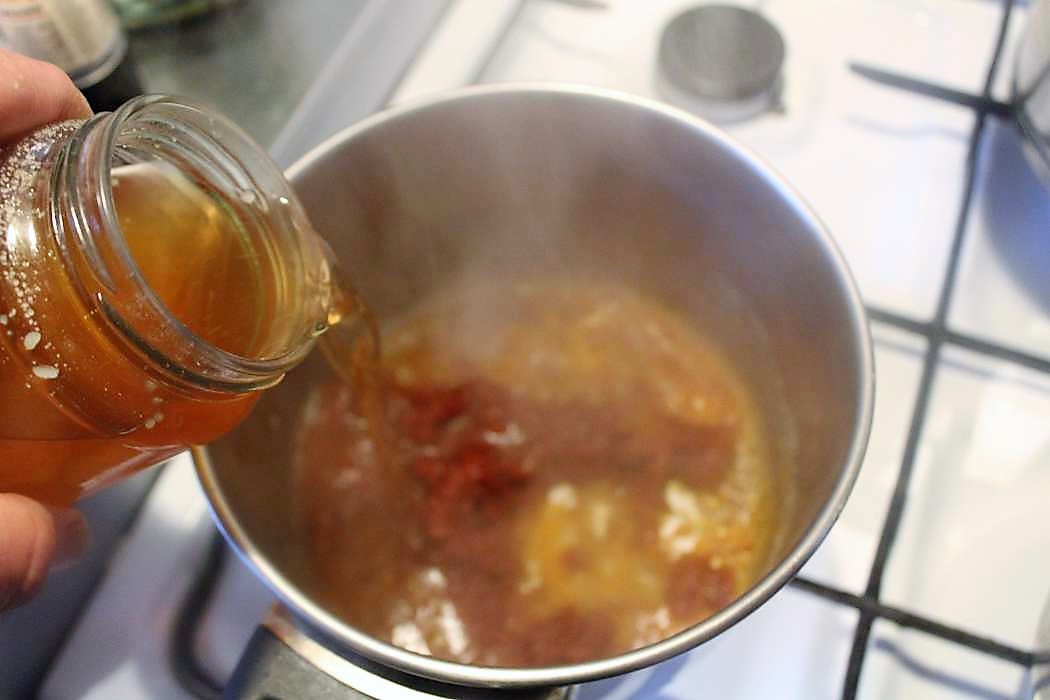 Wenn Butter, Mehl, und Tomatenmark angeschwitzt sind und der Topfboden anfängt braun zu werden, kommt schluckweise Brühe in den Topf