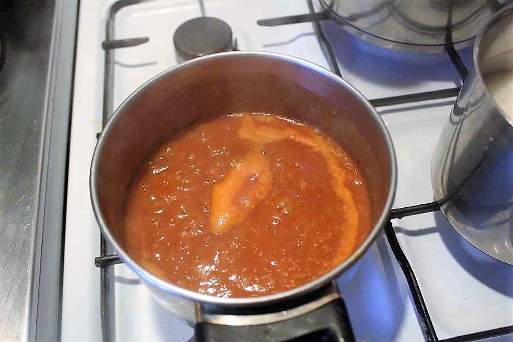 Die kommt auch noch in den Topf und unter häufigem Umrühren, soll die Soße aufkochen und dann durch das Tomatenmark, die Butter und das Mehl sichtbar andicken.