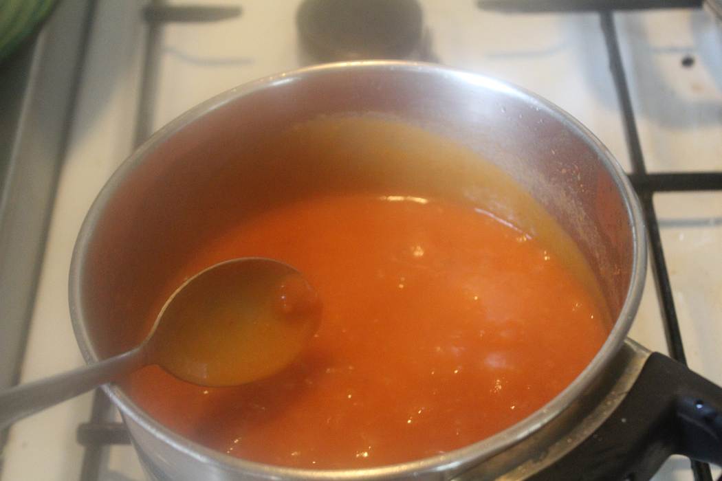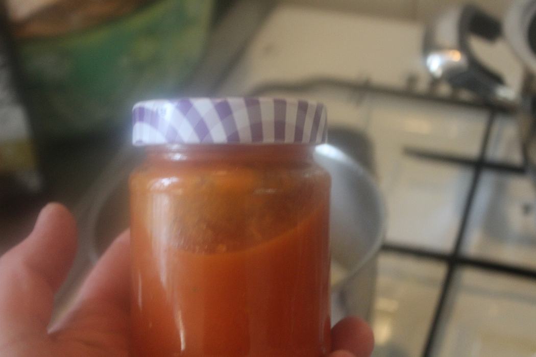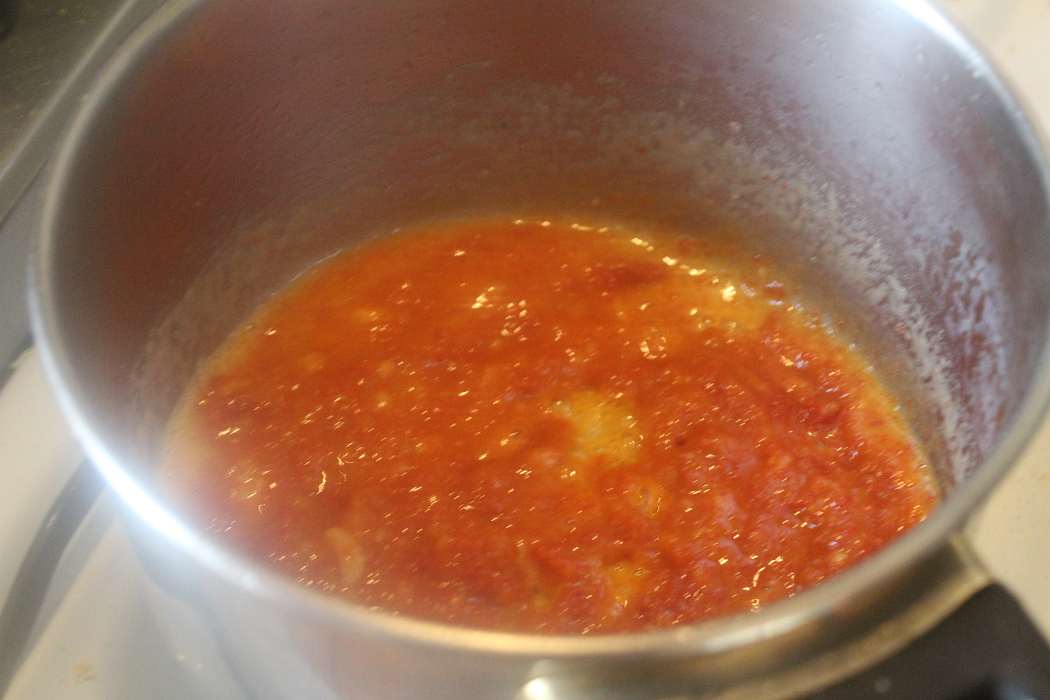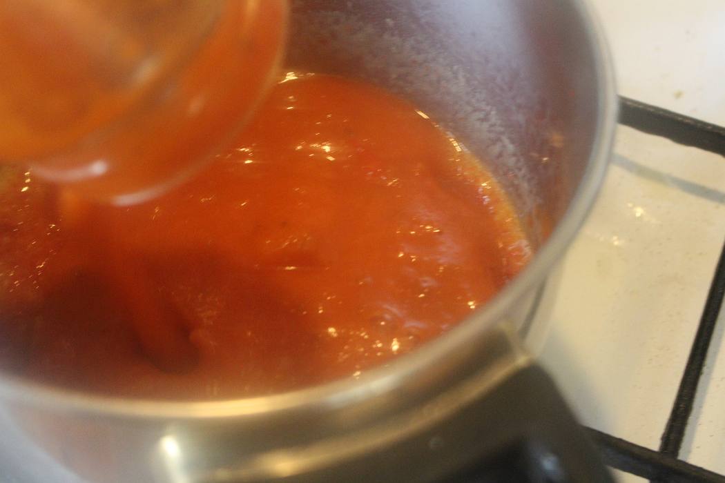 Meine selbst gemachte Tomatensoße. Wer das nicht hat, kann auch passierte Tomaten verwenden.