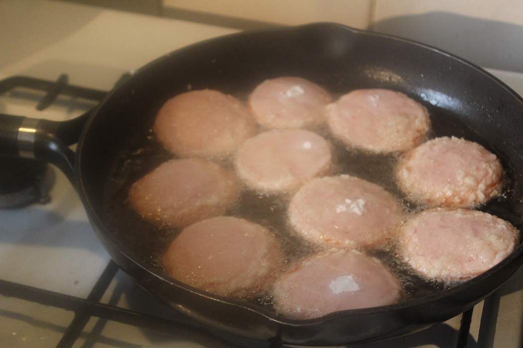 Die Jagdwurstscheiben ins Fett werfen und drei Minuten pro Seite ausbacken.