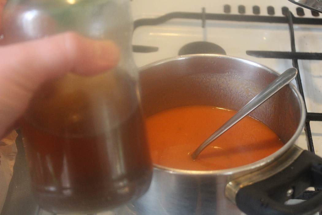 Tomatensoße zum Mehl und der Butter geben, alles verrühren und den Bodensatz vom Topf abkratzen