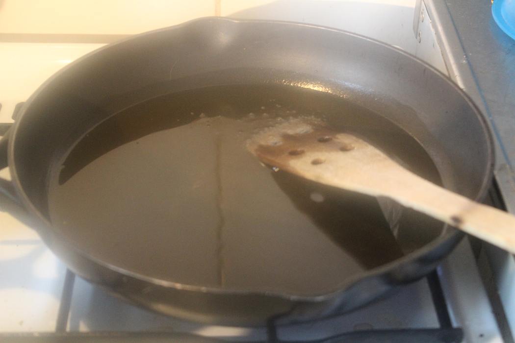 Pfannenwender in die Bratpfanne stellen, in der daumendick Rapsöl erhitzt wird, bis daran die Blasen schnell aufsteigen, dann hat das Fett die richtige Temperatur.