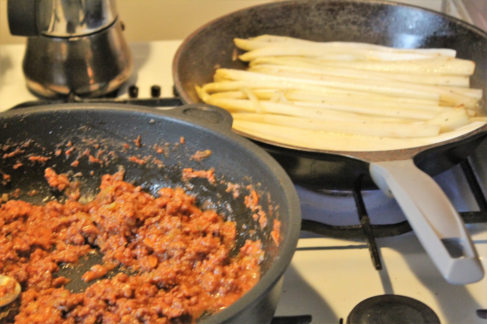 Die Bolognese soll auch schon fertig und heiß auf den Spargel warten.