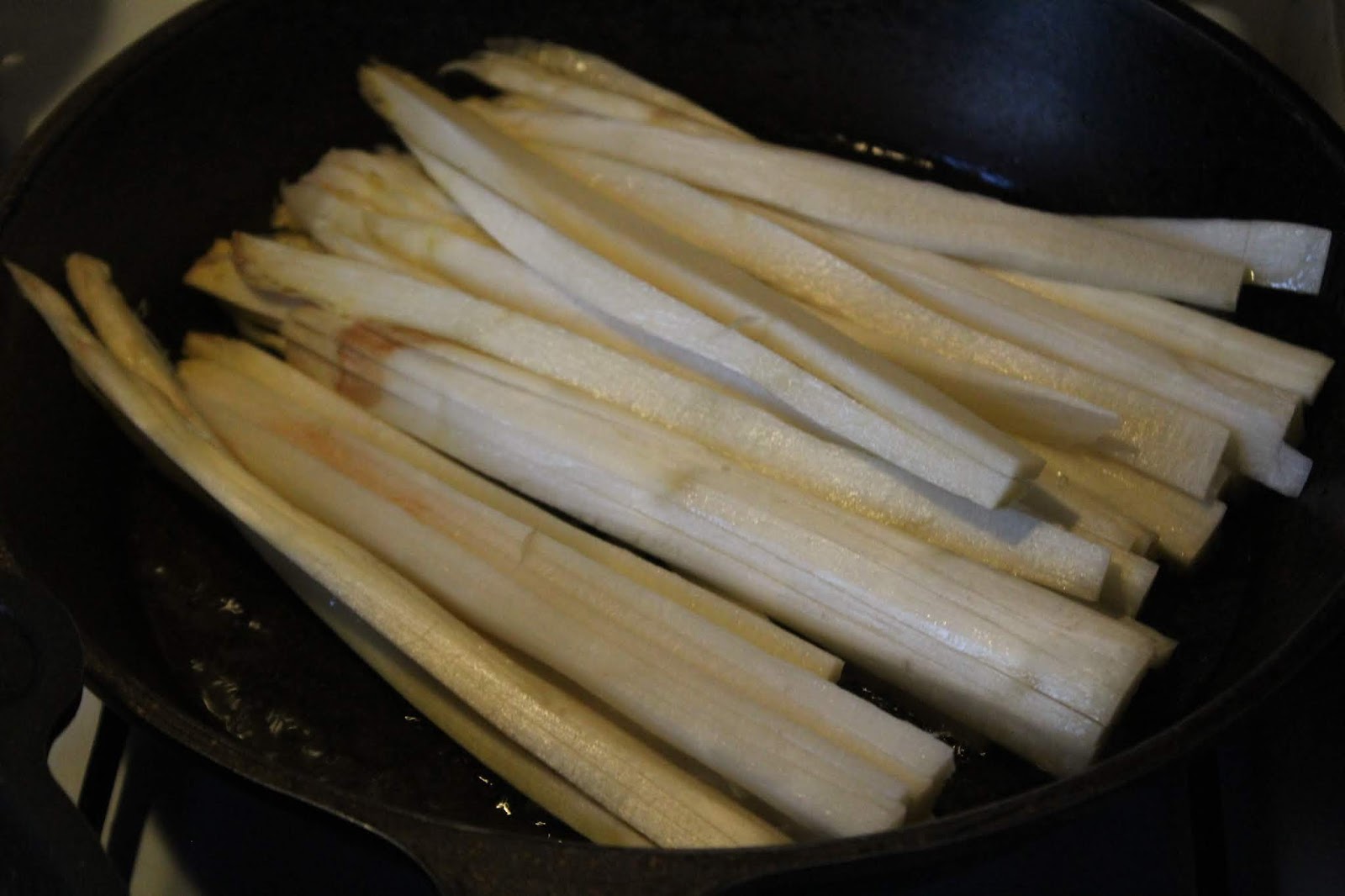 Wenn das Öl heiß ist, kommt der Spargel hinzu