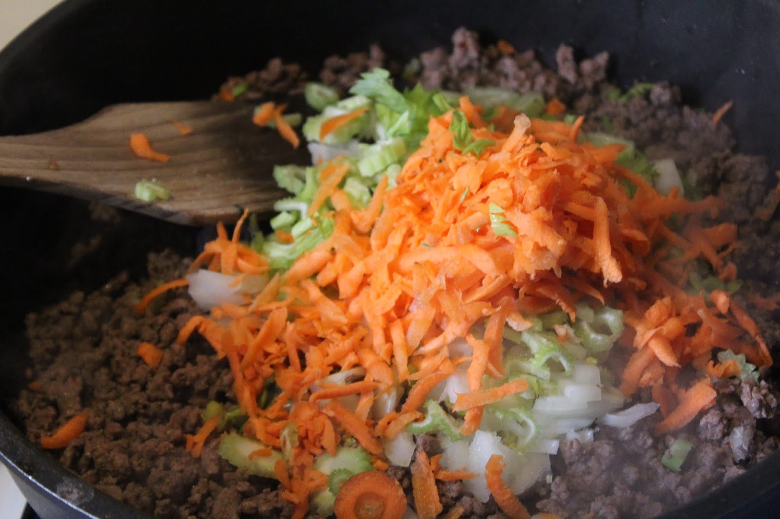 Während des Anbratens, kann man schon Piment, Wacholderbeere und Lorbeerblatt in die Pfanne werfen. In der Zeit schneide ich auch schon das Gemüse vor und gebe es in die Pfanne. So lange es nur oben auf dem Fleisch liegt, stört es nicht beim Anbraten. Ich rühre erst dann um, wenn das Fleisch schon Farbe bekommen hat.