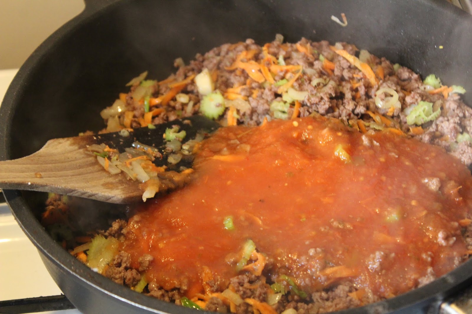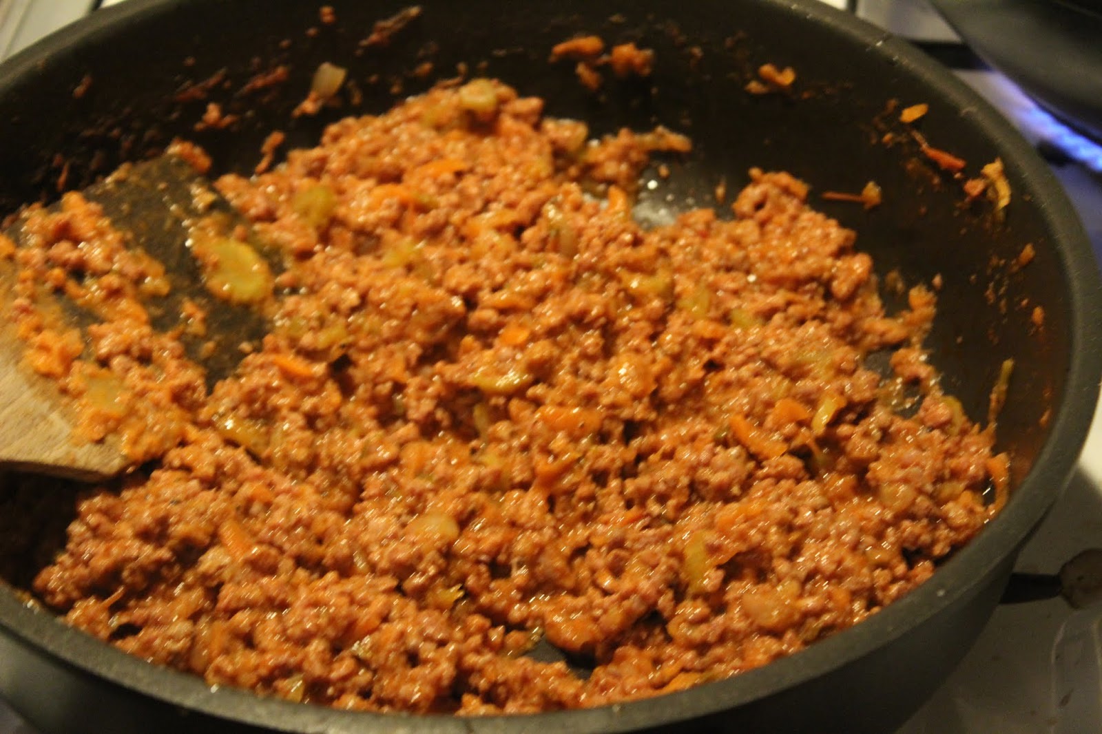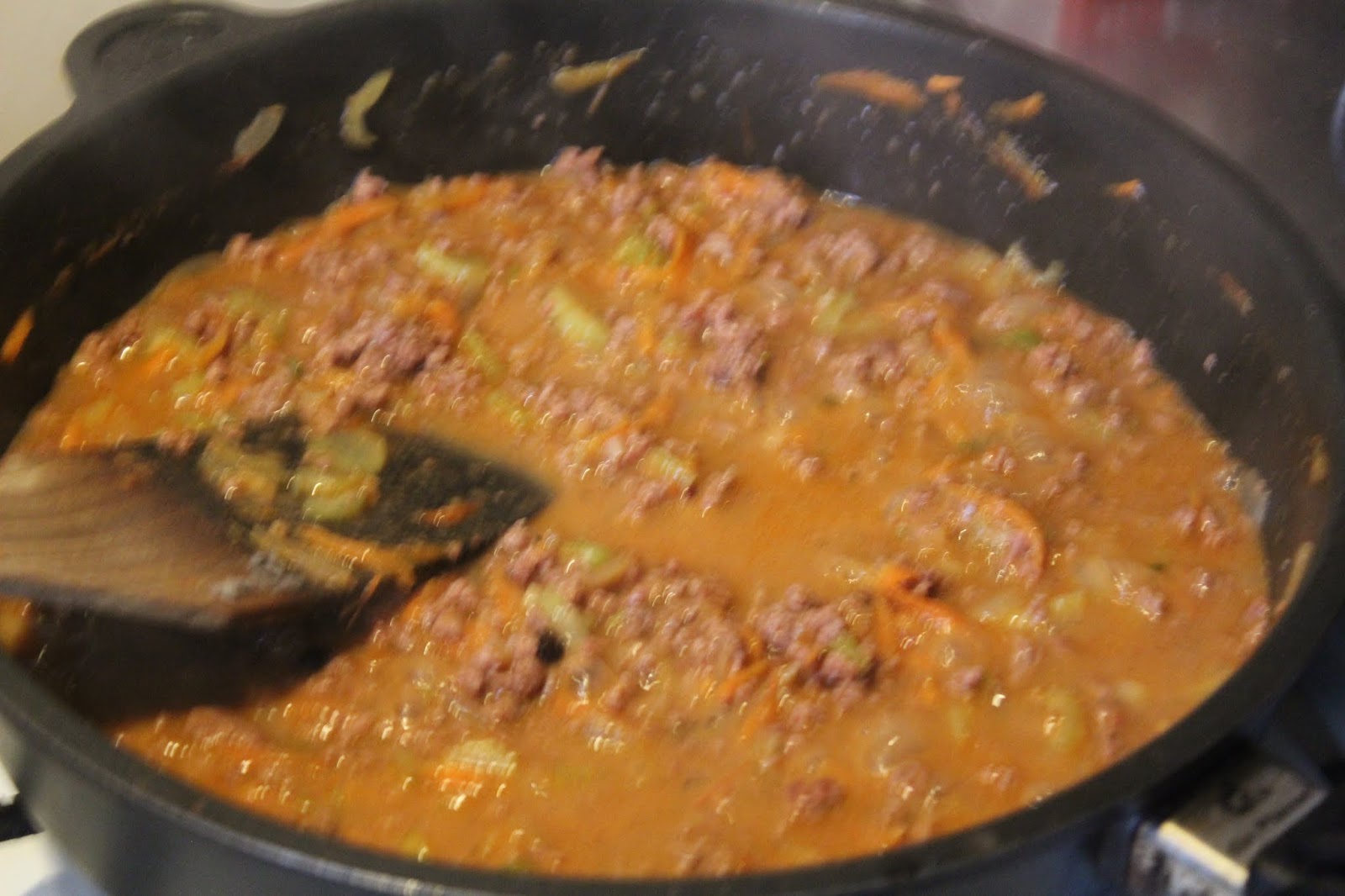 Wenn man die Brühe gleichzeitig reingiesst, wird die Bolognese erst nach dem erneuten Aufwärmen am nächsten Tag richtig schön rot, aber deswegen kann man sie ja auch schon einen Tag vorher zubereiten.