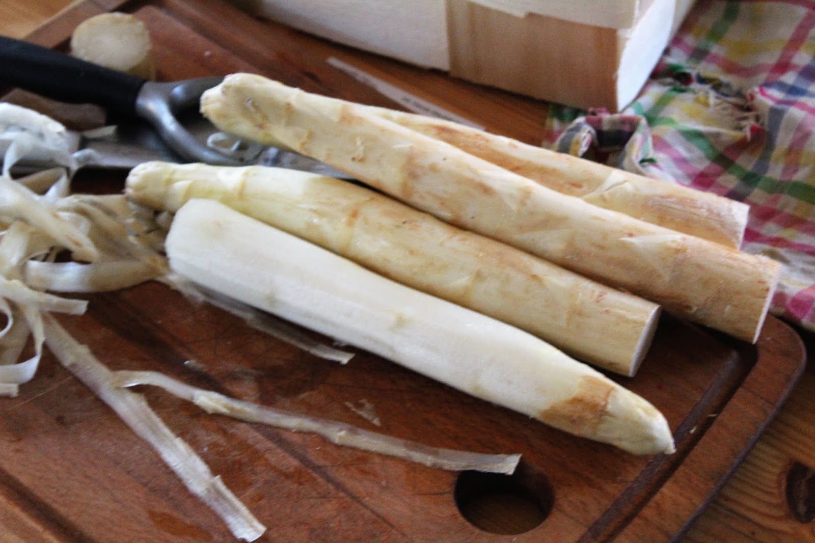 Holzige Enden abschneiden und mit dem Sparschäler die Schale entfernen