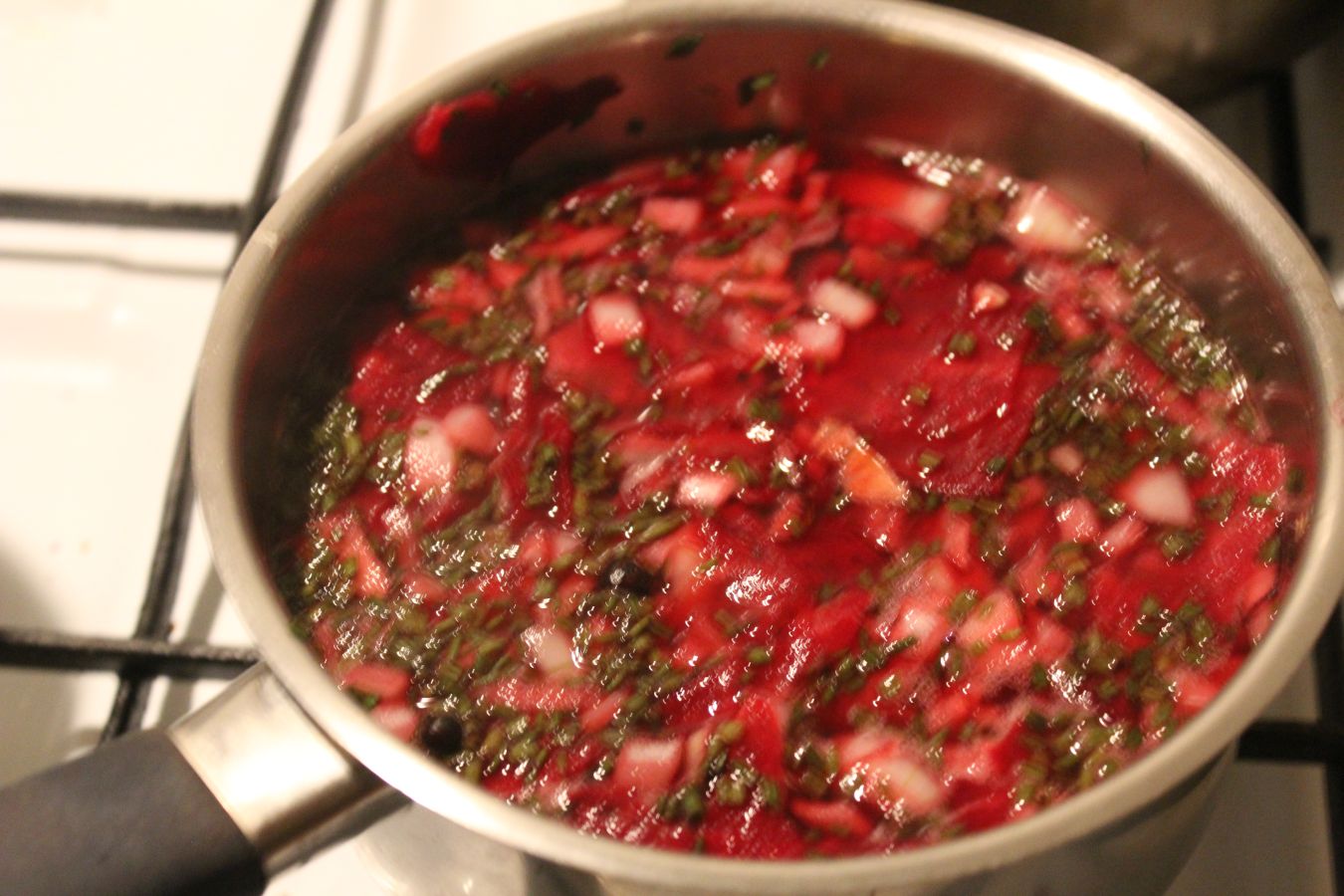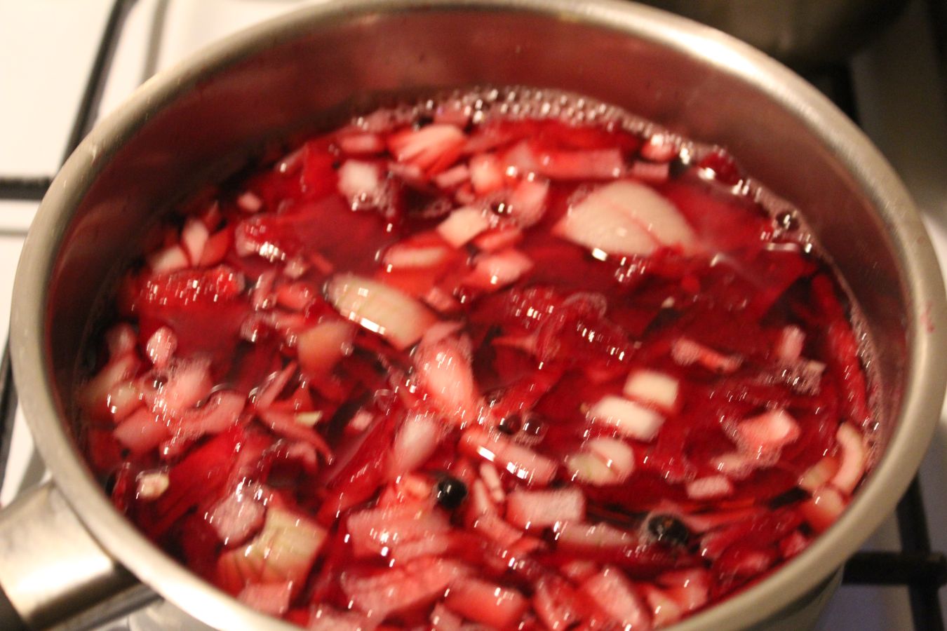 Die Flüssigkeit einmal mit den roten Beten im Topf aufkochen, bis die Flüssigkeit sprudelt, dann sofort den Herd abstellen.