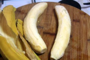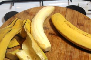 Kochbananen an den Spitzen abschneiden. Die Schale geht schwerer ab, als bei den bekannten süßen Bananen, aber kein Hürde. Ein bisschen mehr Kraft aufwenden und schon ist die Kochbanane nackig.