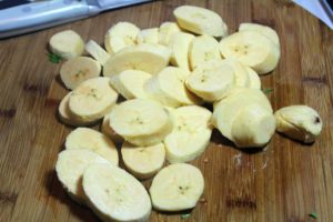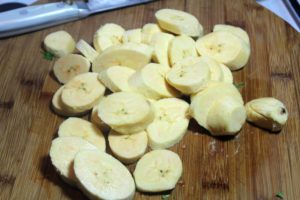 Kochbananen mit einem scharfen Messer in Scheiben schneiden.