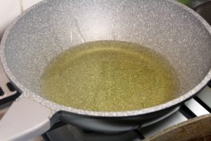 Einen Pfannenwender aus Holz in die Pfanne legen und warten bis sprudelnd Blasen daran aufsteigen.