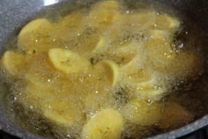 Nun noch den Rest der Kochbananen ins Rapsöl geben. 10 Minuten Garzeit, wenn sie im sprudelnden Fett liegen mit der Temperatur von Vollgas auf 2/4 reduzieren, damit nichts zu schnell und zu braun wird.