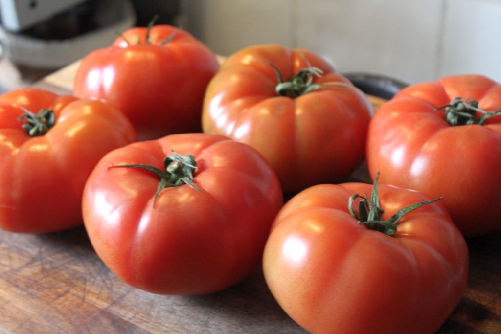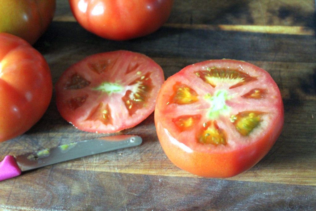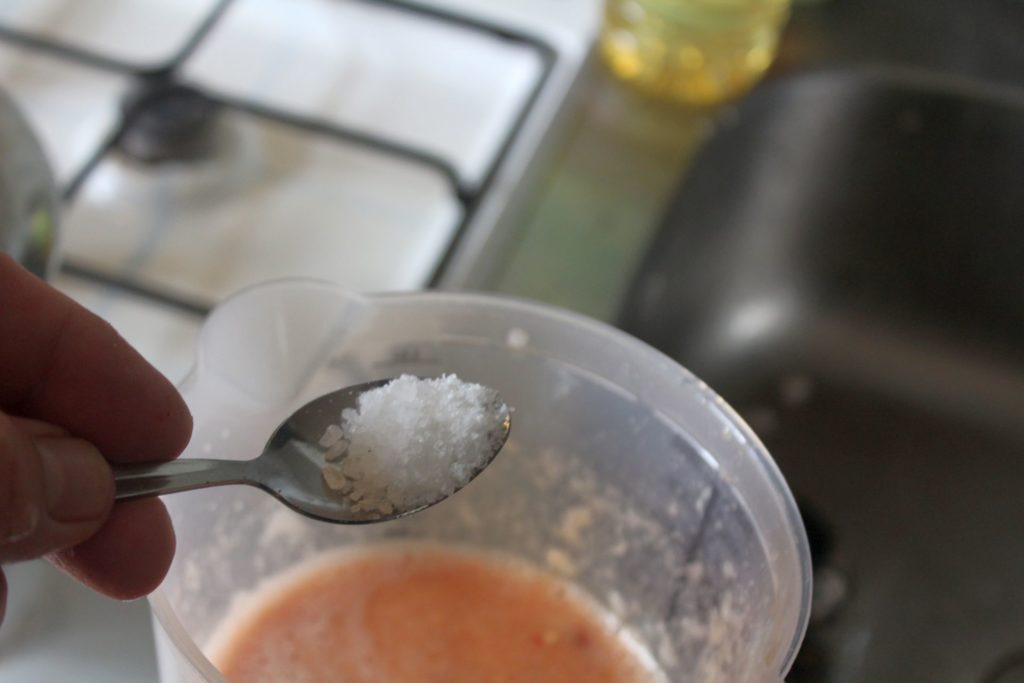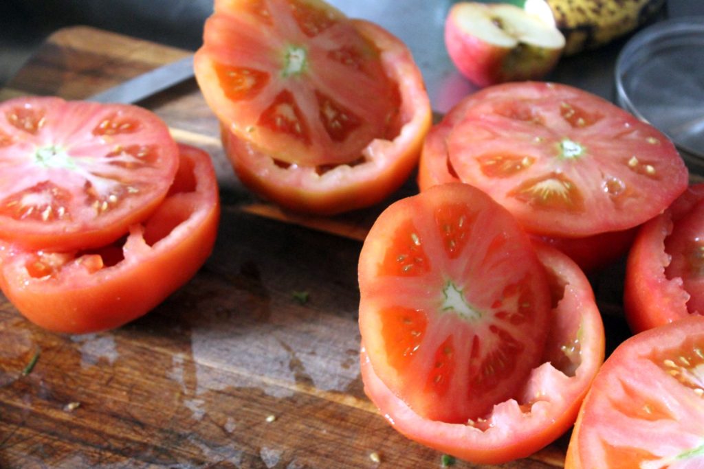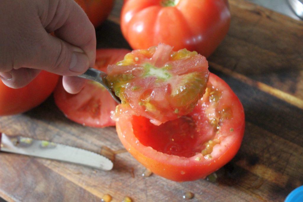 Innenleben der Tomaten mit einem Esslöffel ausheben und aufpassen, dass man dabei die Haut nicht verletzt. Nicht wegschmeißen, sondern in einem Litermaß zwischenlagern.