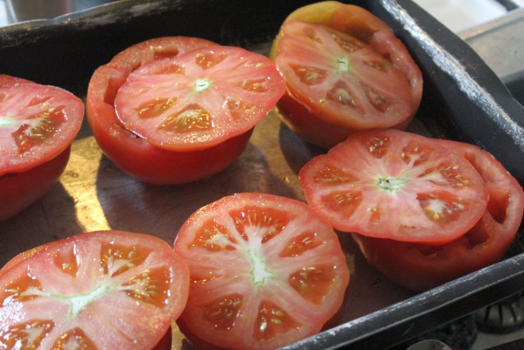 Ofenform in den Ofen stellen. Nach 60 Minuten sind die Tomaten gar, wenn man die Deckel im Blick hat und die nicht zu dunkel garen lässt, dann kann man auch 90 Minuten im Ofen schmoren lassen.