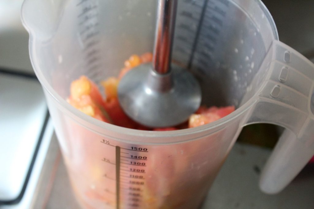 Die gesammelten Tomateninnenleben, mir fällt kein besserer Begriff ein, mit dem Zauberstab, oder einem Pürierstab schreddern