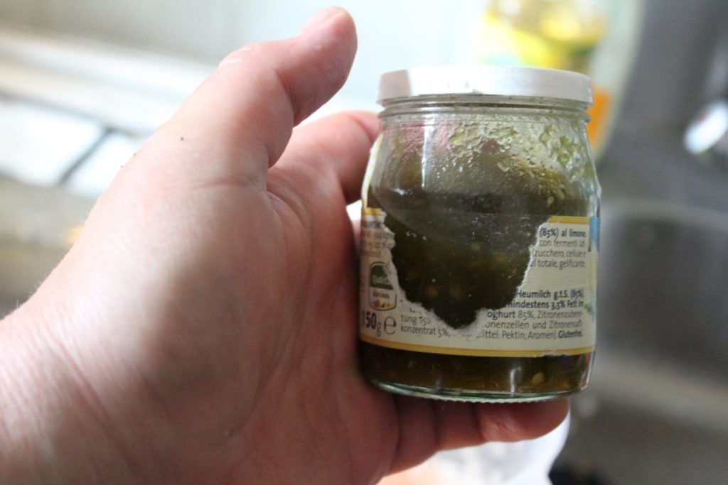 Sriracha mit Bärlauch (anklicken). Man kann auch Tabasco, oder eine andere scharfe Würzsoße nehmen.