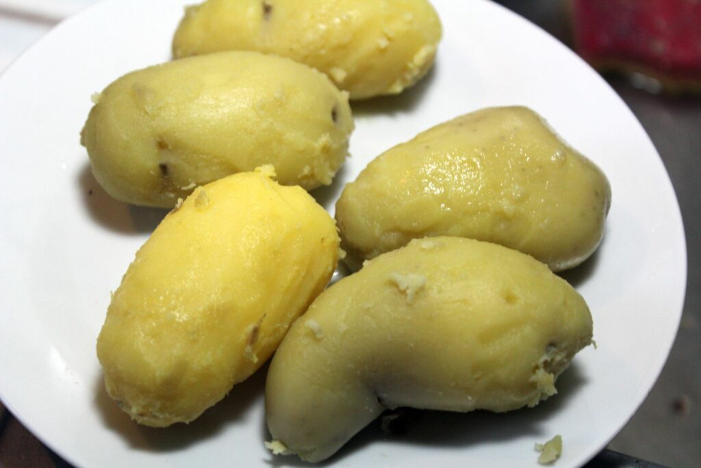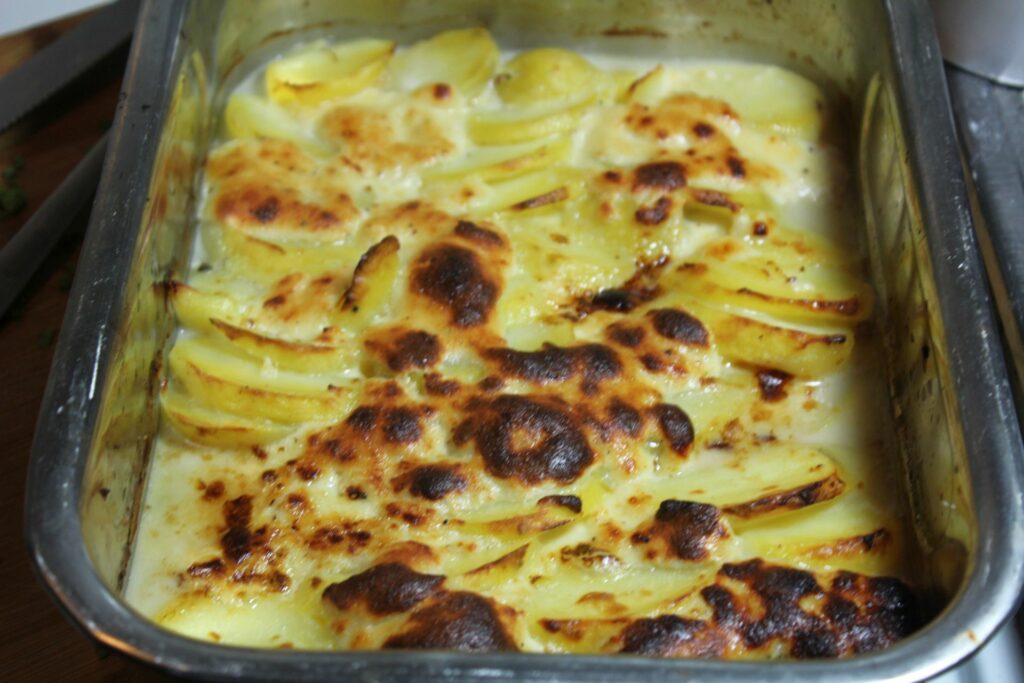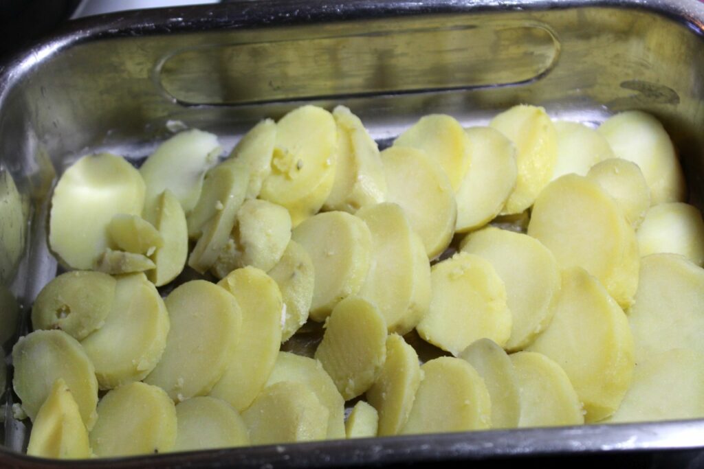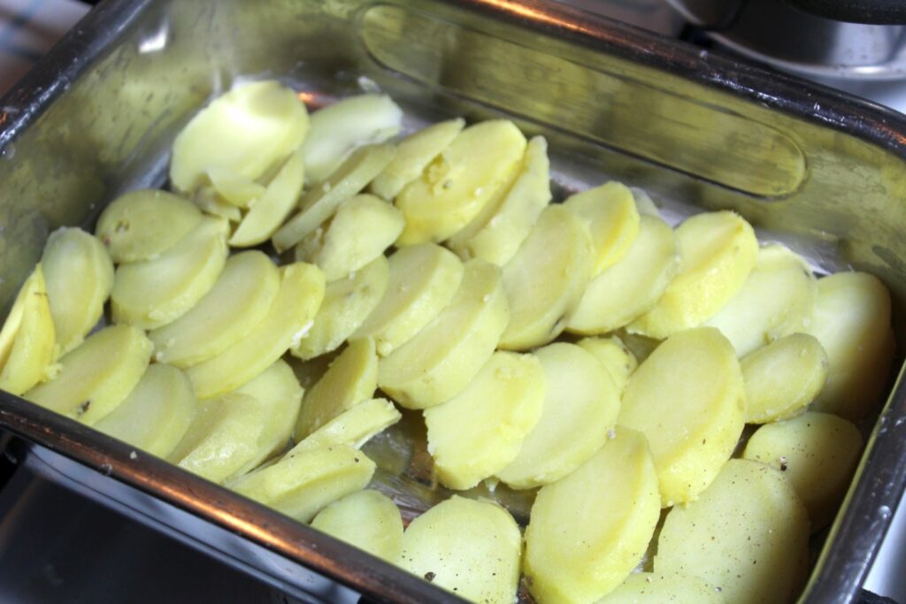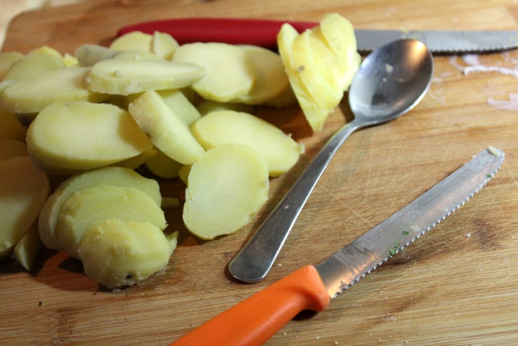 Ich bin jeden Monat drei Tage in Bayern und anschließend arbeite ich den Rest den Monats von Zuhause. Als ich wieder da war, habe ich die Kartoffeln schon von meiner Frau als Pellkartoffeln gekocht, vorgefunden. Es ist natürlich Ehrensache, dass ich die nicht umkommen lasse. Pellkartoffeln werden kalt aufgesetzt und 20 Minuten kochen gelassen, bis sich die Haut wellt. Die ließen sich kalt gut abziehen. Ich habe daraus ein Ofengericht gemacht. Das passt gut in der Woche und erst Recht, wenn man noch nicht so genau weiß, wann alle am Tisch sitzen. Hier war es konkret so, dass meine Familie zum Impfen nach Charlottenburg musste und das waren locker 20 km durch die Stadt. Da kann in Berlin keiner sagen wie lange es von der Abfahrt bis zur Rückkehr dauert. Also ist es auch wichtig, dass man es gut warmhalten kann und nicht erst anfängt zu kochen, wenn die Familie wieder an die Burg kommt.