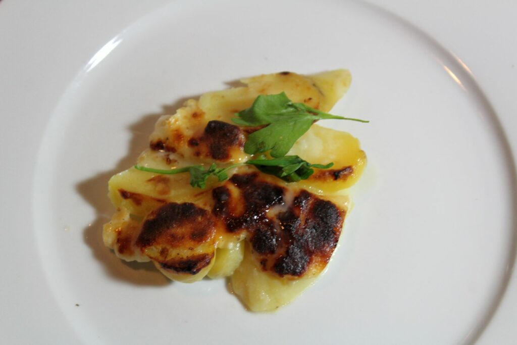 Soße über die Kartoffelscheiben gießen und in den Ofen bei 150 Grad stellen