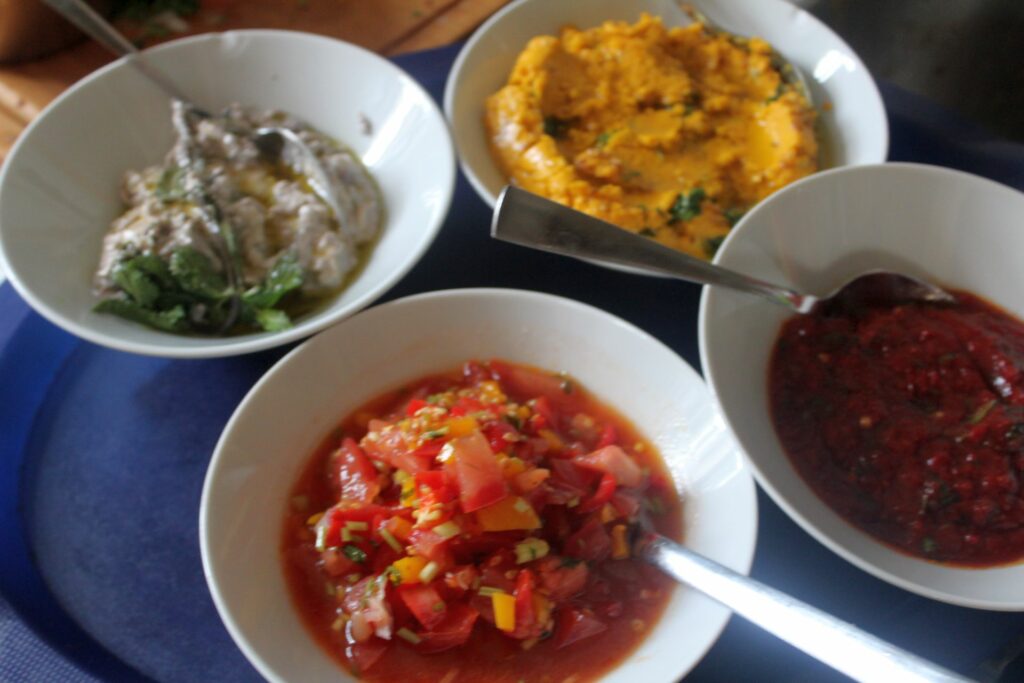 Auberginenpaste, Möhrenhummus, Chorizo mit Rotwein geschmort (nicht vegetarisch), Bruschetta, Minipaprika süßsauer