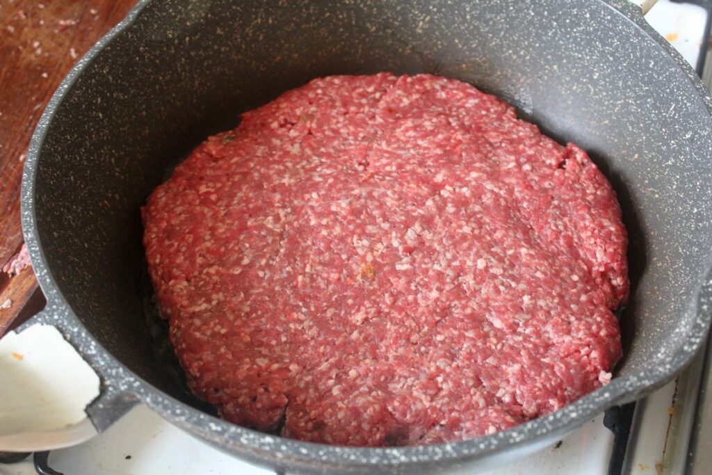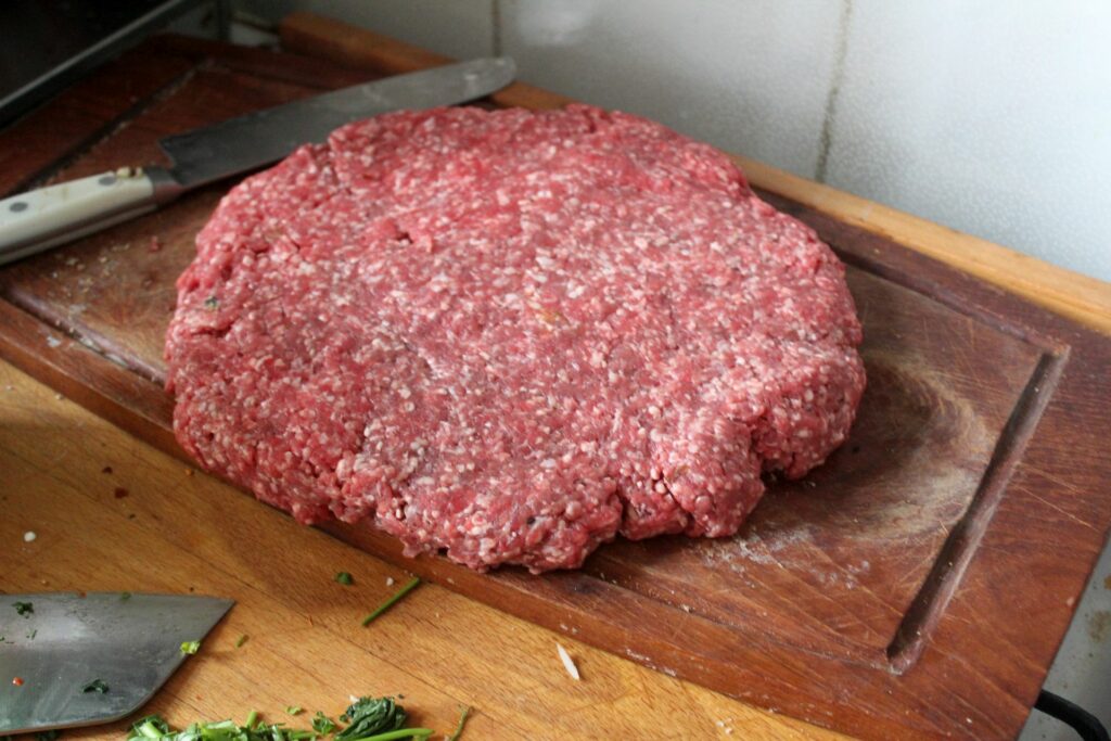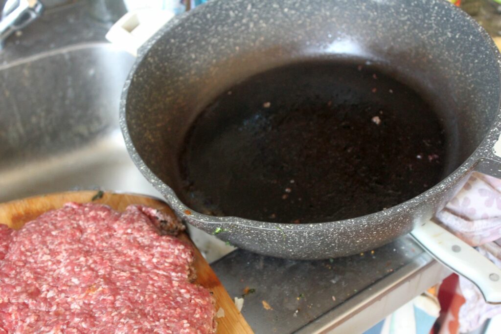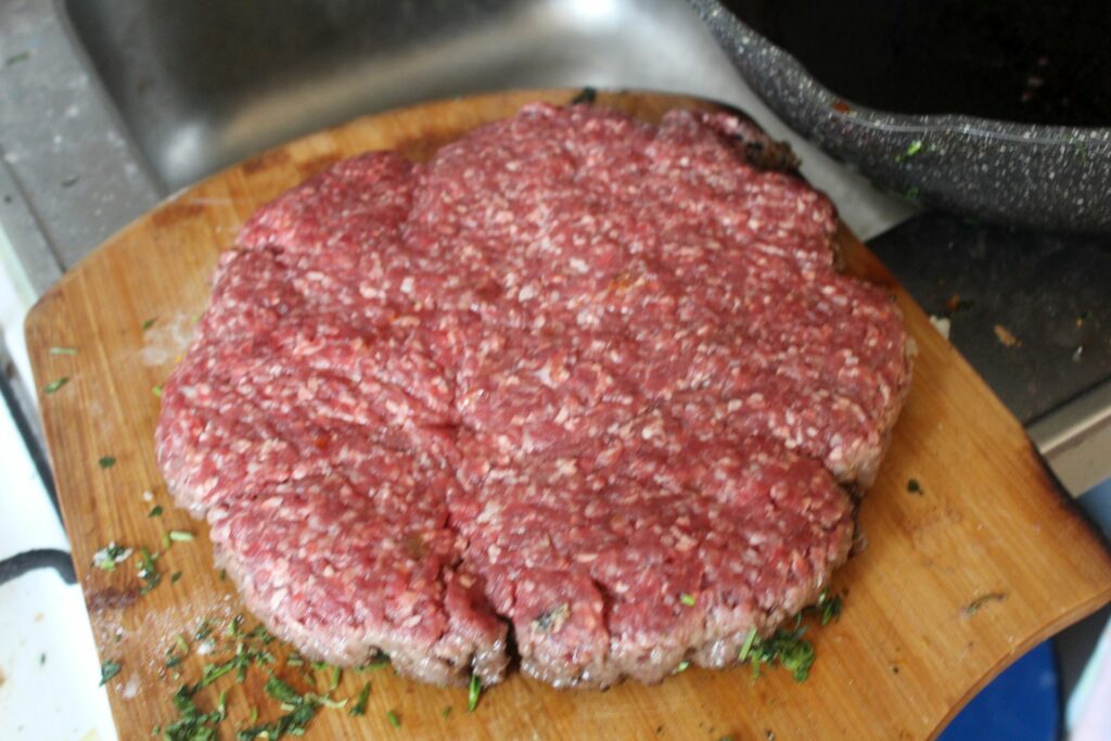 So weit sind wir aber noch nicht. Zum Wenden des Burgerpatties lasse ich das Fleisch aus der Pfanne auf ein Brett rutschen lassen
