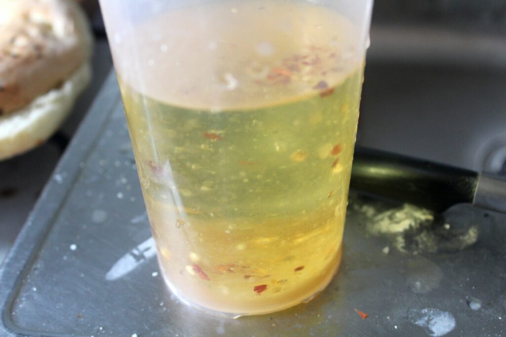 200 Milliliter Rapsöl, 1 Teelöffel Senf, 1 Esslöffel Essig, 1 Ei, 1/2 Teelöffel Salz, 1 Prise Chiliflocken. 2 Knoblauchzehen pressen