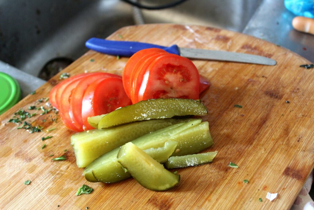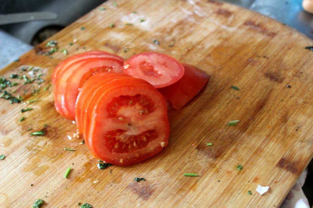 Ich schneide die Deko. Tomate in Scheiben schneiden