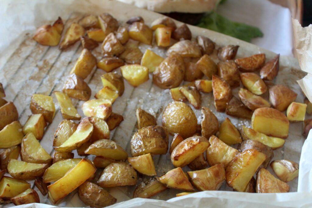 Burgerpattie kommt mit den Kartoffeln in den Ofen