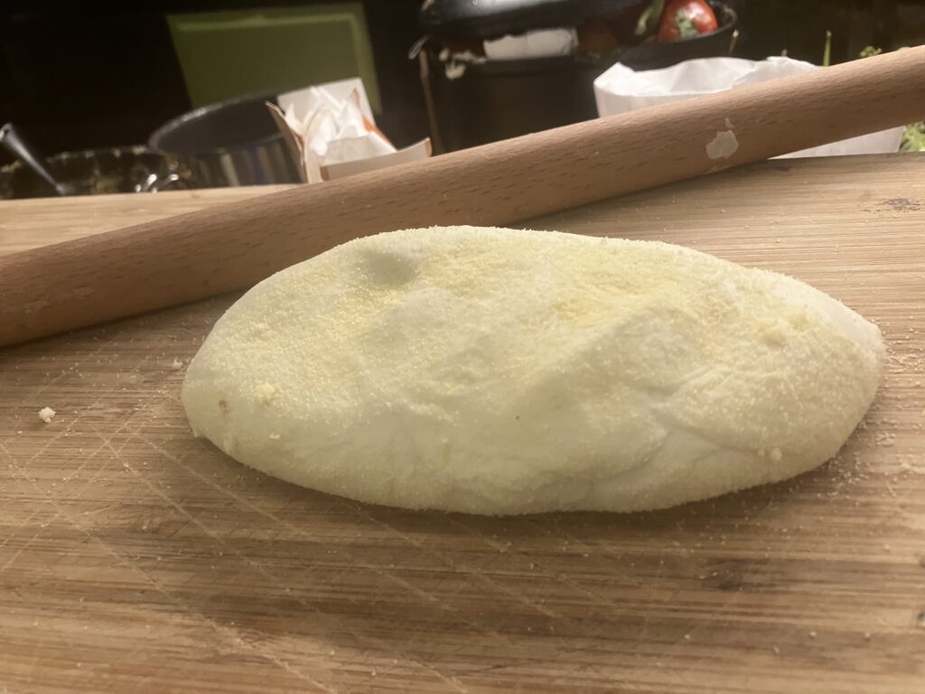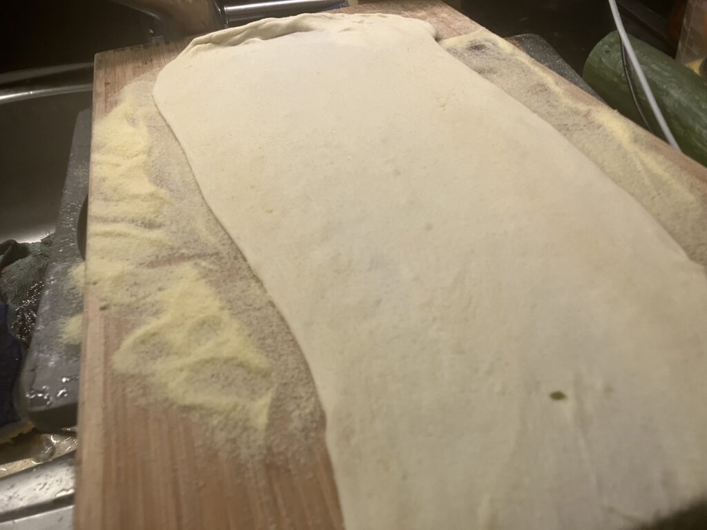 Ich teile den Teig und streue eine Arbeitsplatte mit Grieß aus.