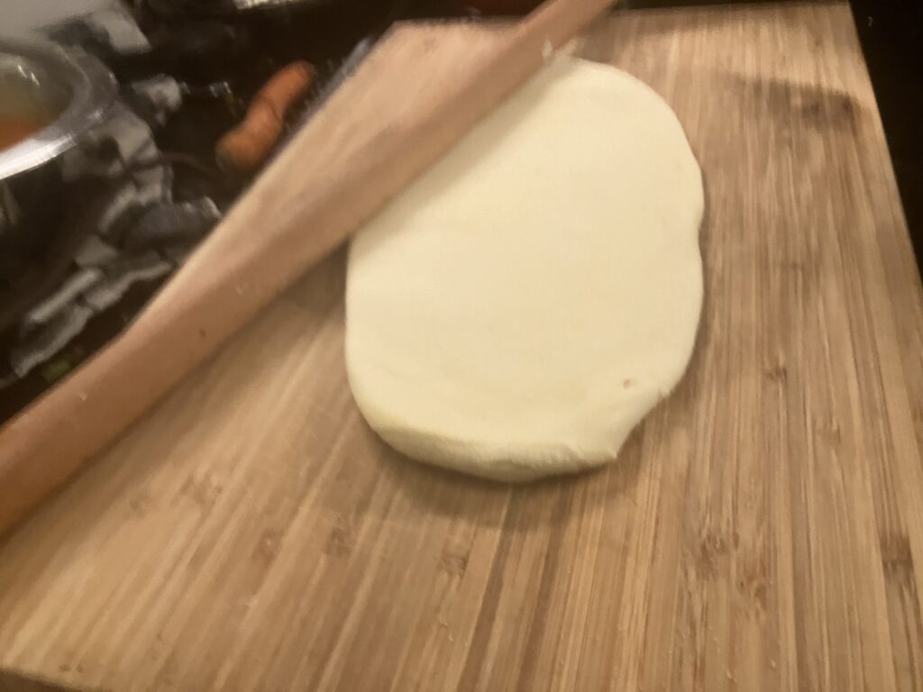 300 Gramm Mehl auf die Teigmenge, sind für mich ein Gericht für zwei Personen, wenn es sonst nichts gibt, oder eine kleine Vorspeise für vier Personen