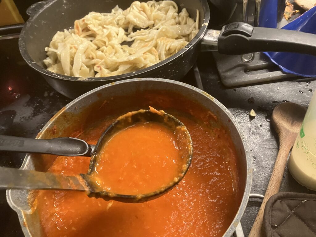 Zwei Kellen Tomatensoße zu den Nudeln geben