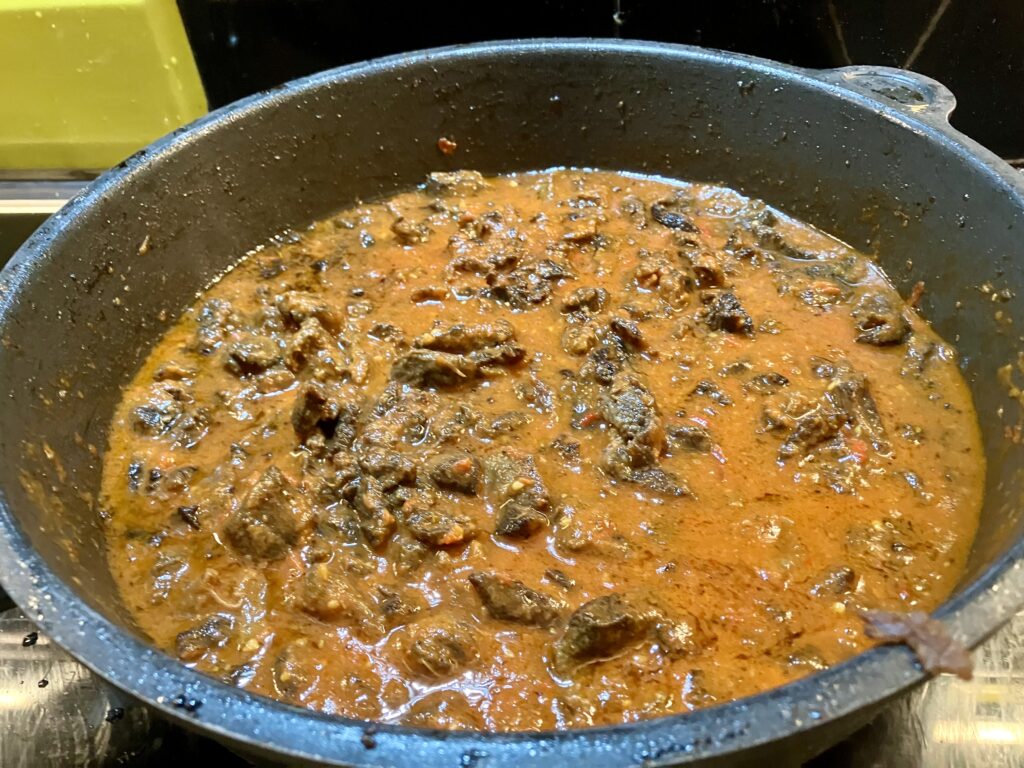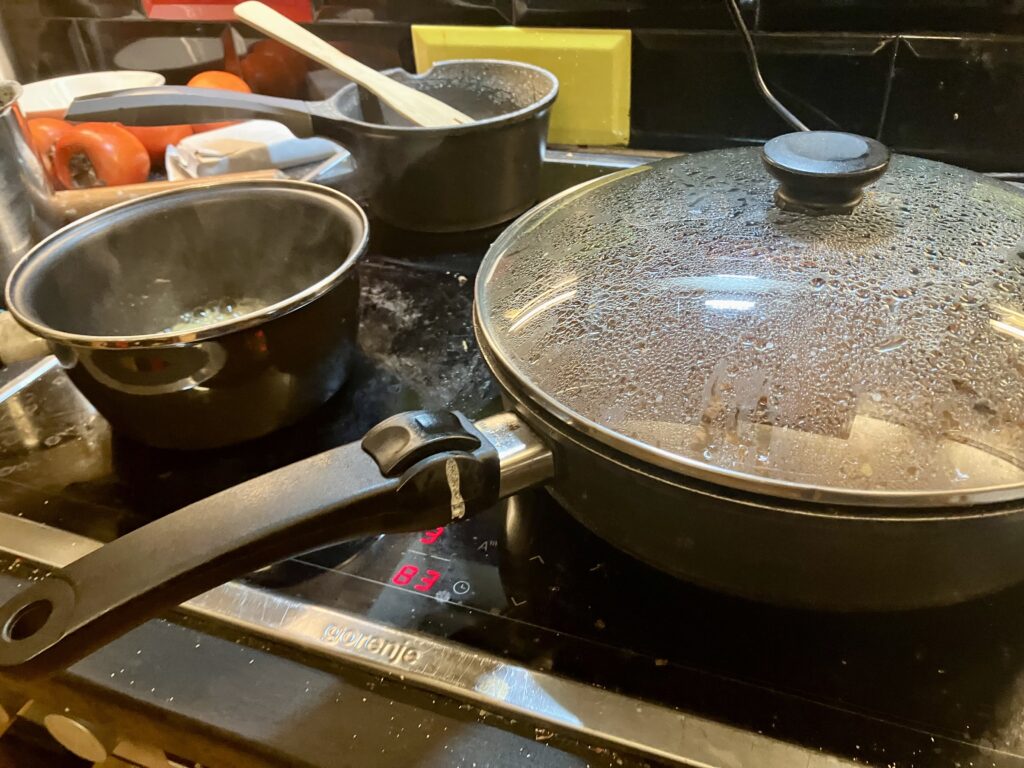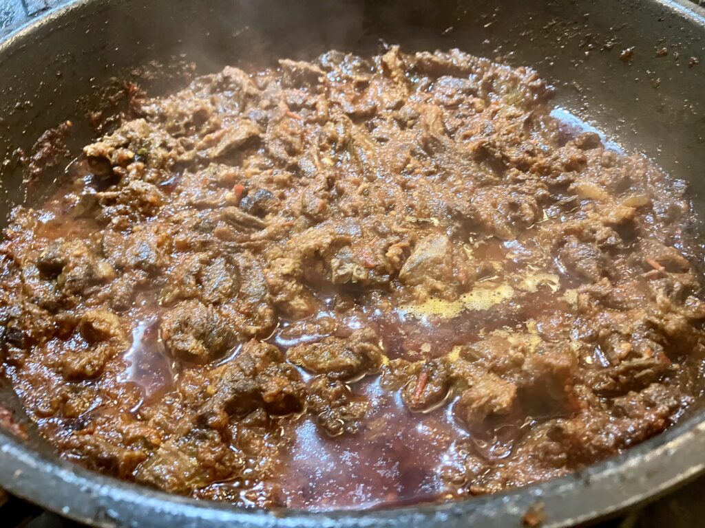 Das Fleisch ist übrig vom Vortag und wir kochen es mit Tomatensoße langsam weich.