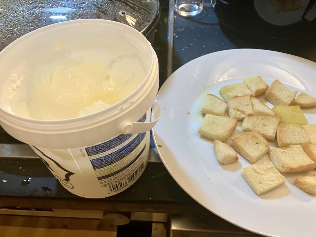Das Brot mit Olivenöl beträufeln und im Toaster, Backofen, oder Heißluftfritteuse kross machen und in Vierecke schneiden.