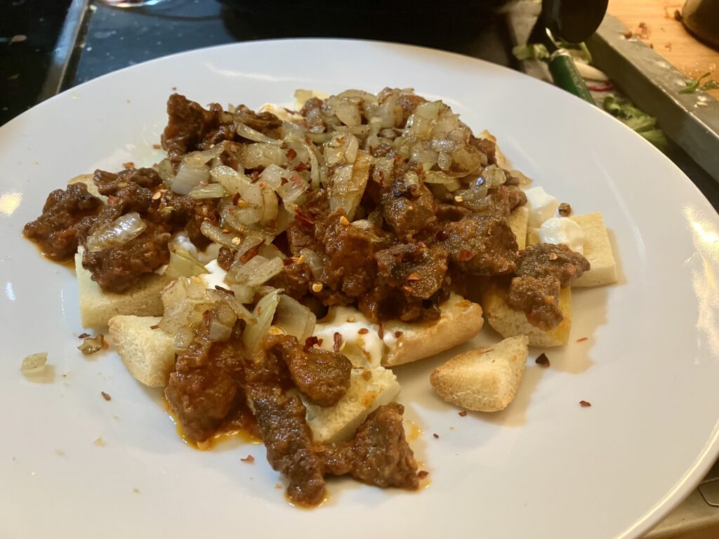 Zwiebeln, je nachdem wie viele Portionen Ihr zur gleichen Zeit machen wollt. Ich habe erstmal mit einer angegfangen und damit allen anderen Hunger gemacht und das so als Referenzessen rumgezeigt, damit alle wussten, was ein Iskender Döner ist. Wusste sonst nämlich niemand.
