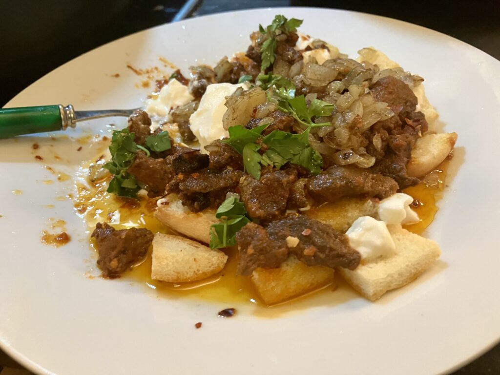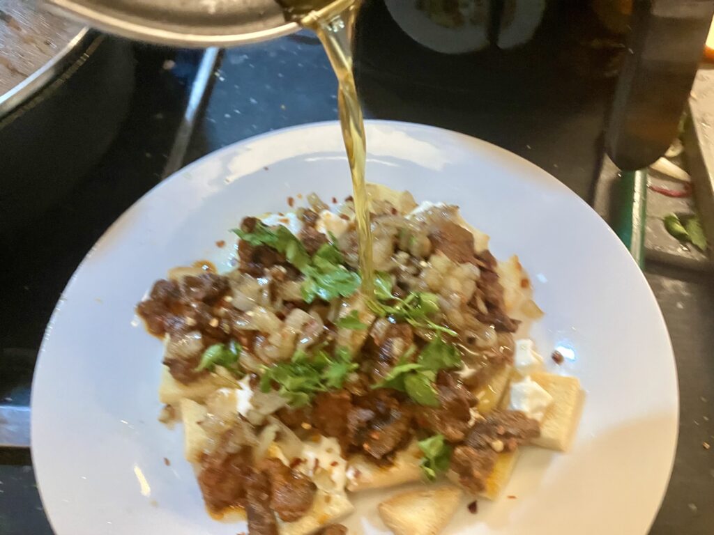Und jetzt kommt der Clou, in der Türkei kommt oft der Koch direkt an den Tisch, und kippt einem die sprudelnd kochende Butter über den Iskender Döner. So habe ich das auch selbst in Antalya erlebt und das musste ich unbedingt wieder haben.