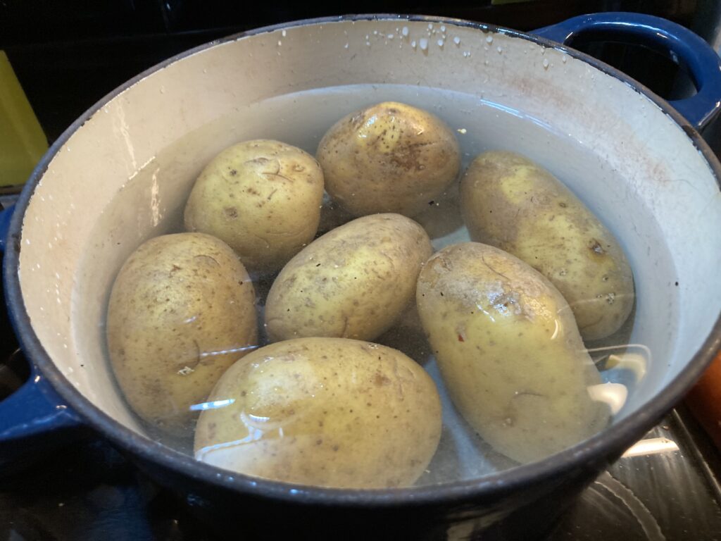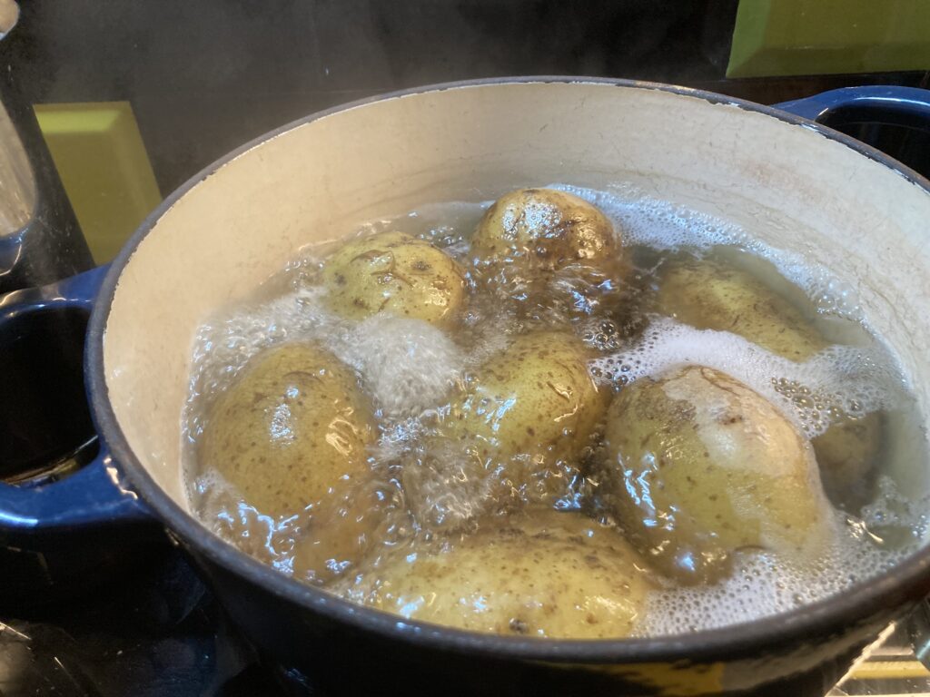 Die Kartoffeln abwaschen, dann kalt aufsetzen und dreiundzwanzig Minuten kochen, ab dem Zeitpunkt, wenn das Wasser kocht.