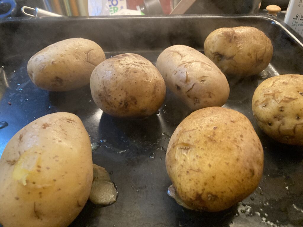Die Kartoffeln haben jetzt dreiundzwanzig Minuten gekocht und kommen auf ein Backblech, um weiter bei 150 Grad im Ofen zu garen. Dadurch bekommt man diese typisch leicht runzelige Oberfläche, die große Ofenkartoffeln haben.