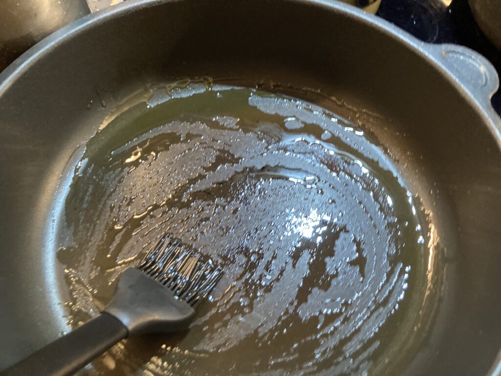 Olivenöl mit dem Pinsel verstreichen und die Pfanne knallheiß werden lassen. Weil ich zwei Stücke Fleisch habe, nehme ich zwei Pfannen.