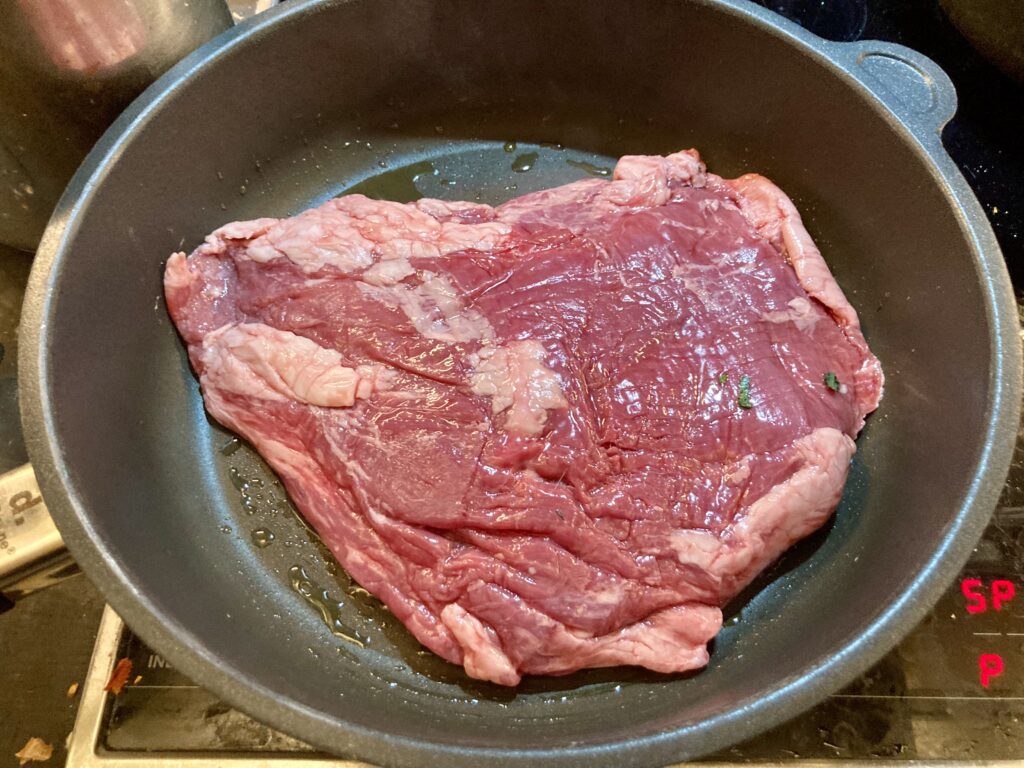 Ich lege das Fleisch zum Servieren wieder in die Pfanne und legen den Deckel drauf, damit es nicht auskühlt