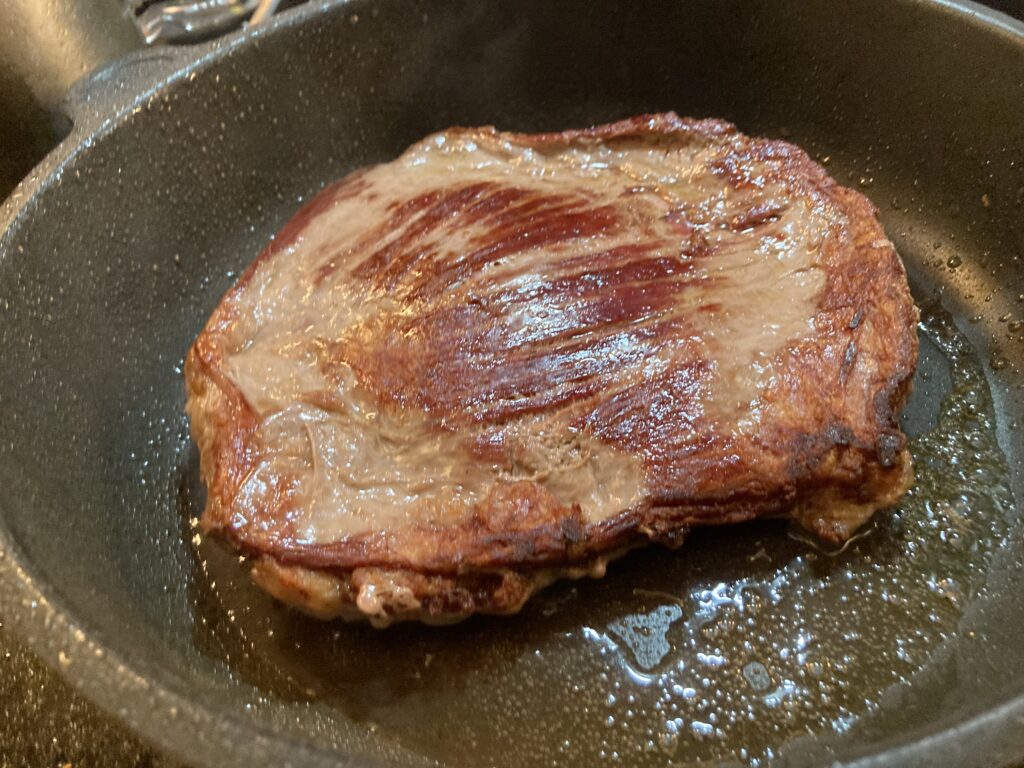 Das sind jetzt die zweiten fünf Minuten in der Pfanne. Danach ist man noch weit von den 58 Grad weg.