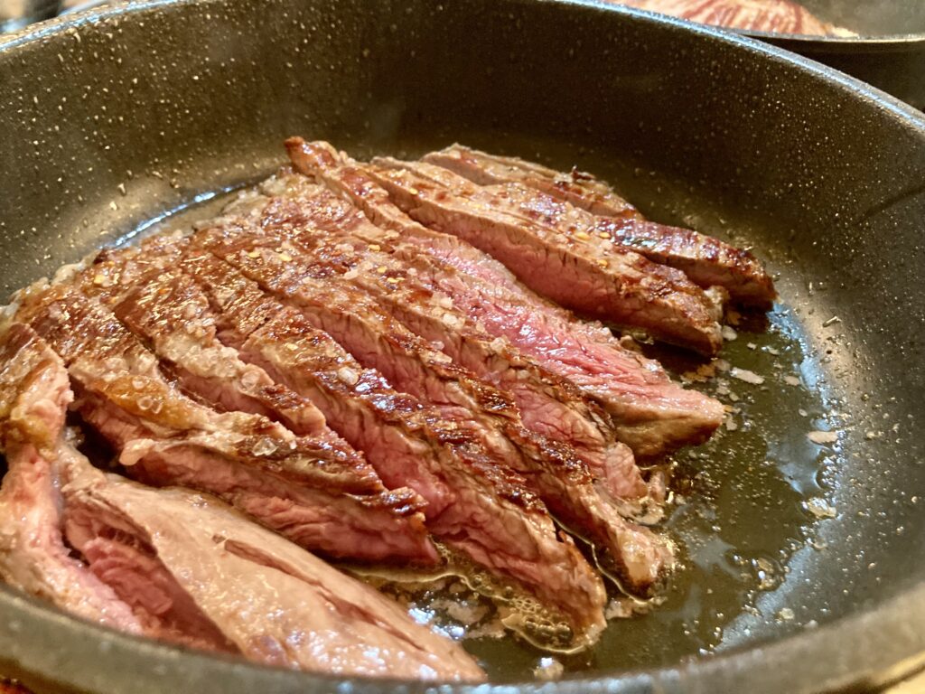 Jetzt kommt das Flanksteak auf den Teller. Nach Geschmack kann man nun noch Chiliflocken darüber verstreuen