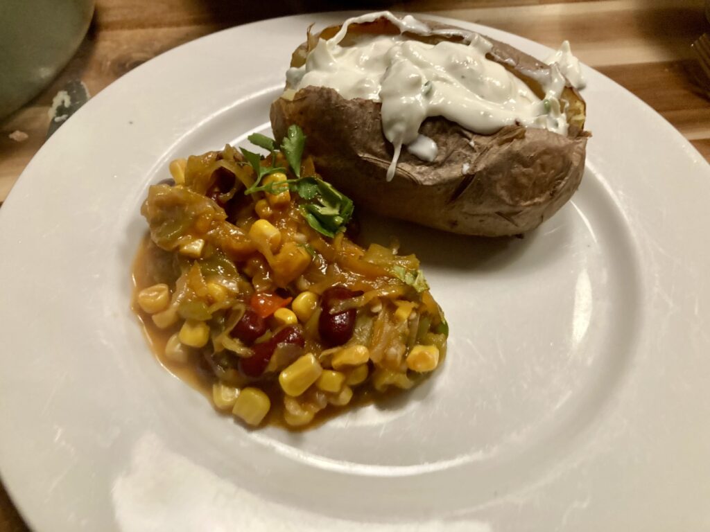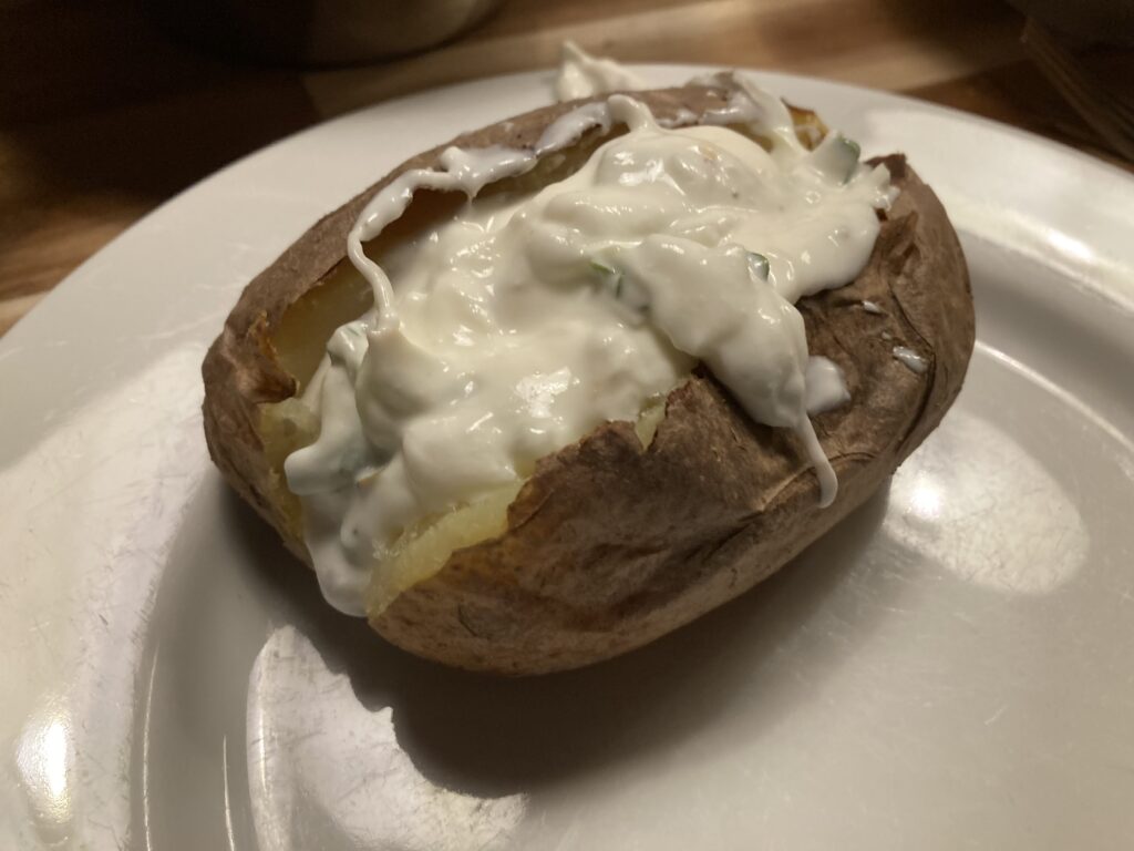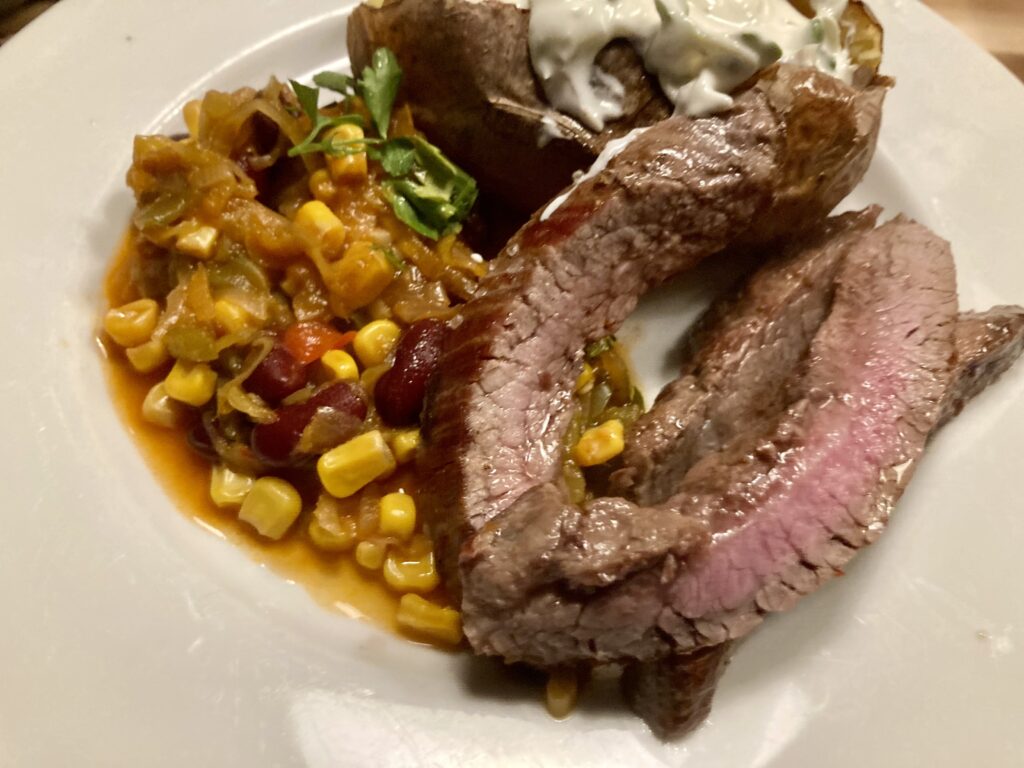 Flanksteak wollte ich seit 2016 essen. Das ist ein Stück vom Bauchlappen, Damals war das scheinbar ein neuer Zuschnitt und das Kilo kostete bei acht Euro, aber normal unter zehn Euro pro Kilo. Ich habe das erste Mal online darüber gelesen. Das war aber schwer zu bekommen und dann habe ich ewig versucht das bei Metro am Ostbahnhof zu kaufen und die haben es aber nie gehabt, auch wenn online dafür geworben wurde. Ich habe dann also nie welches gekauft und jetzt kostet das Flanksteak pro Kilo locker 25 Euro, aber auch gerne den doppelen Betrag. Ich war letztens beim Handelshof und da lag eine halbe Tonne argentinisches Flanksteak wegen Mindesthaltbarkeitsdatum für € 6,94 pro Kilo. Da musste ich nach acht Jahren Wartezeit zuschlagen und habe locker 2,5 Kilo gekauft. Ich habe mich eingelesen und festgestellt, dass man zwischen 50 und 58 Grad Kerntemperatur anstreben sollte. Weil hier keiner gerne zu rohes Fleisch isst, habe ich die 58 Grad angepeilt. Dazu gibt es mexikanisch anmutendes Gemüse, Sour Cream und Ofenkartoffeln. Von der Wertigkeit ist das für mich eher ein Wochenendgericht, aber das schmeckt natürlich an jedem anderen Tag auch.