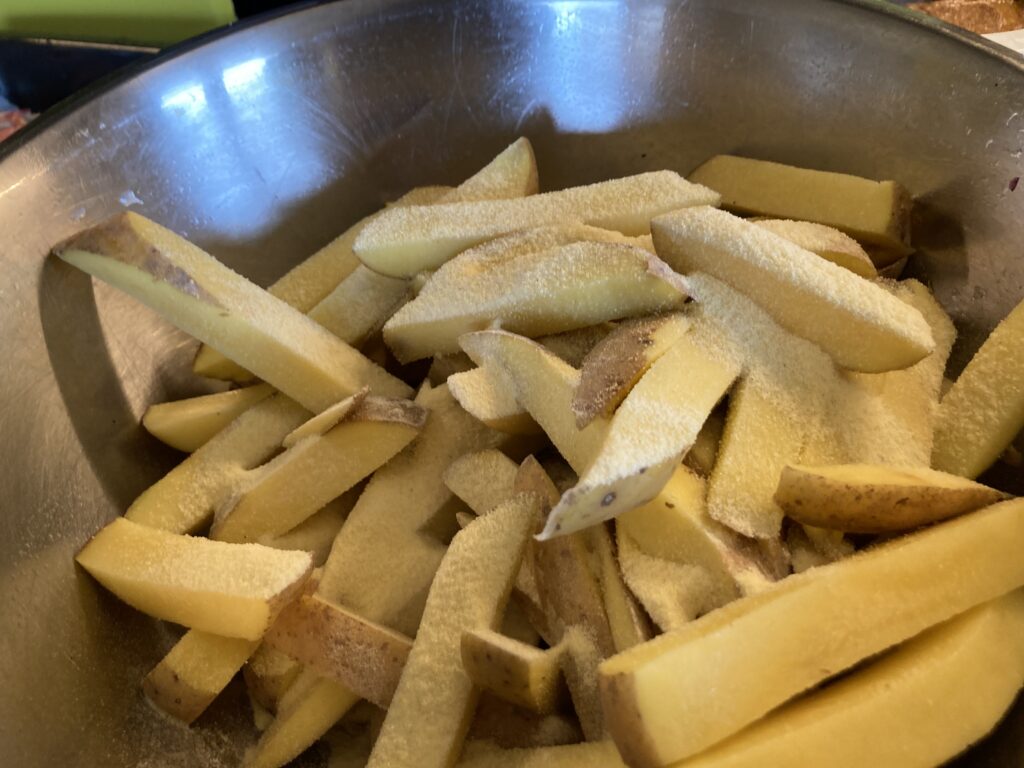 Man kann die Kartoffeln von Hand schneiden, aber ich habe mir bei Ikea so einen Gemüseschneider gekauft, mit dem der Kartoffelschnitt gleichmäßiger wird. Alles kann, nichts muss.