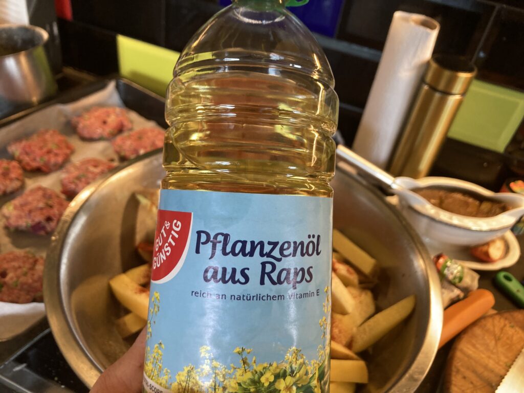 Hier als Begleitung zu faulen Ofenfrikadellen. Ein ganz gemütliches Familienessen. Ich mag die Country Fritten, weil man da mehr im Mund hat, als bei normalen Pommes frites, mehr Knusper, mehr Geschmack.